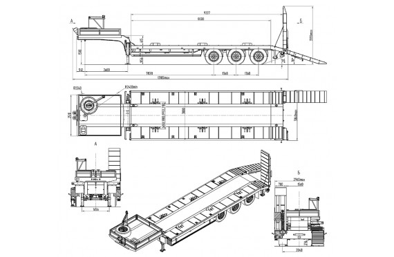 45000 кг, шины 445/65R22,5 или 395/85R20 / 6+1, платформа 10300 (11080 до трапов) x 2500 с уширителями до 3000 мм, приставные алюминиевые трапы, ССУ 1510 мм, рессорная подвеска, съемные стойки 1500 мм, съемные борта