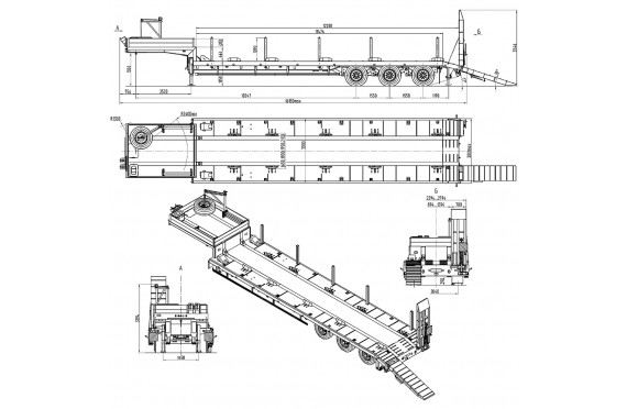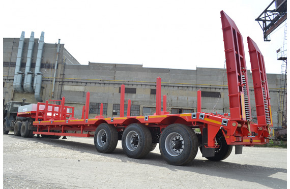 45000 кг, шины 445/65R22,5 или 395/85R20 / 6+1, платформа 10300 (11080 до трапов) x 2500 с уширителями до 3000 мм, механические трапы, ССУ 1510 мм, пневматическая или рессорная подвеска, съемные стойки 1500 мм, съемные борта