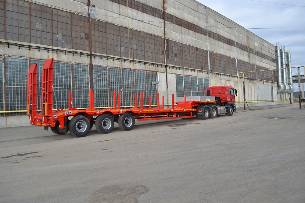 39000 кг, шины 385/65R22,5 или 445/65R22,5 / 6+1, платформа 11080 до трапов) x 2500 с уширителями до 3000 мм, ССУ 1510 мм, рессорная подвеска, съемные стойки 1500 мм, механические трапы