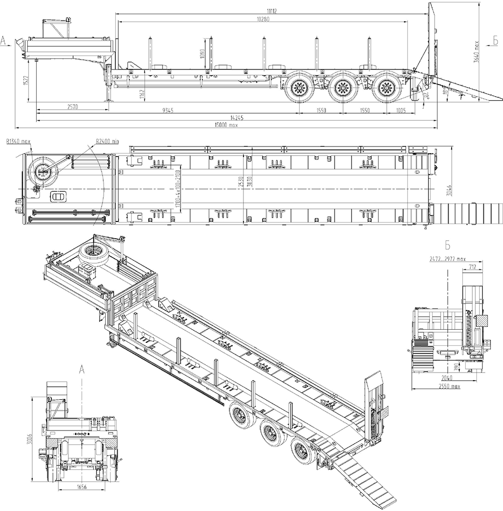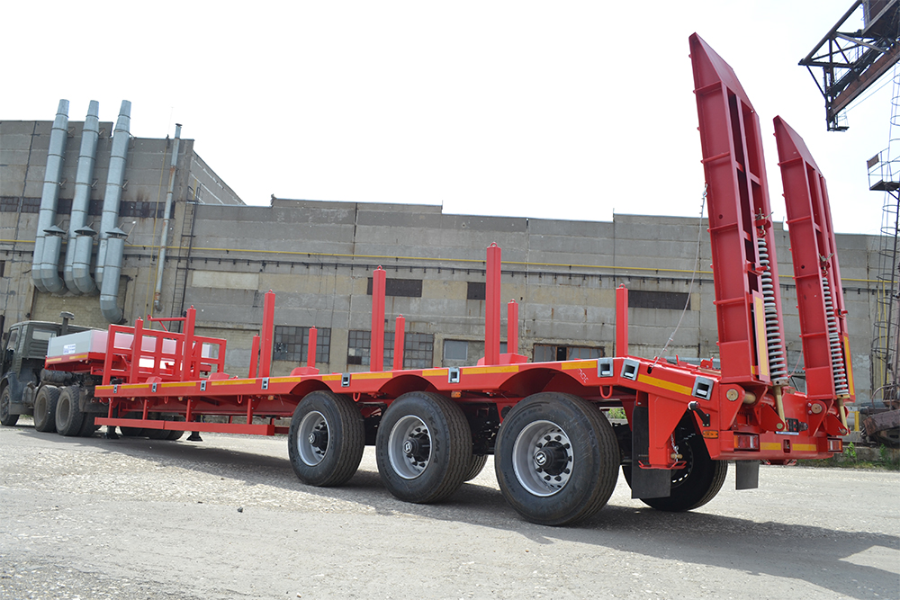 39000 кг, шины 385/65R22,5 или 445/65R22,5 / 6+1, платформа 11080 до трапов) x 2500 с уширителями до 3000 мм, ССУ 1510 мм, рессорная подвеска, съемные стойки 1500 мм, механические трапы