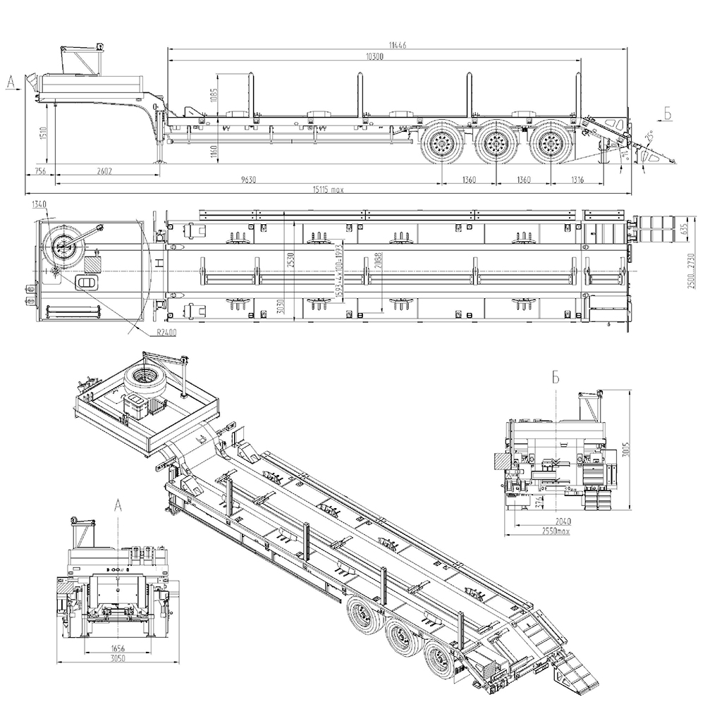31000 кг, шины 385/65R22,5/6+1, платформа 10300 (11446 по трапам) x 2530 с уширителями до 3030 мм, ССУ 1510 мм, аппарели уголкового типа, рессорная или пневматическая подвеска, съемные стойки