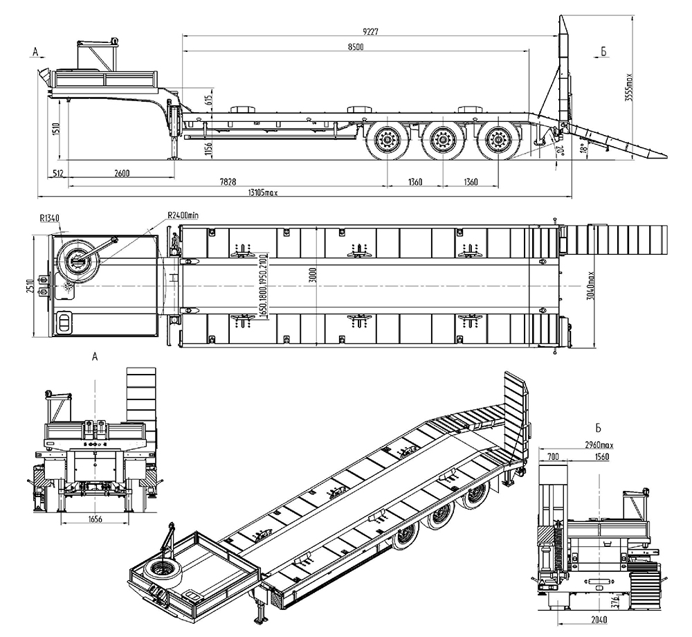 31700 кг, шины 385/65R22,5/6+1, платформа 8500 (9227 до трапов) x 3000 мм, ССУ 1510 мм, рессорная или пневматическая подвеска