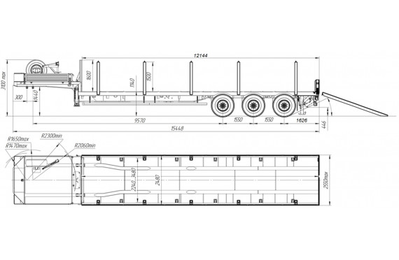 36000 кг, шины 385/65R22,5 / 6+1, платформа без трапов (12200 x 2500 мм, ССУ 1430 мм, пневматическая подвеска, раздвижные коники 1500 мм, съемные борта или без них, с приставными алюминиевыми трапами, с уширителями) в ГАБАРИТЕ по ДЛИНЕ АВТОПОЕЗДА с КАМАЗ 6x6